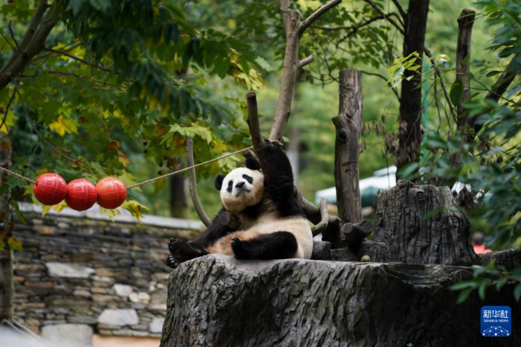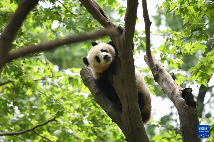 4月19日,在中国大熊猫保护研究中心都江堰基地,大熊猫“叻叻”在树上玩耍。大熊猫“叻叻”,雄性,2021年8月14日出生于新加坡河川生态园。