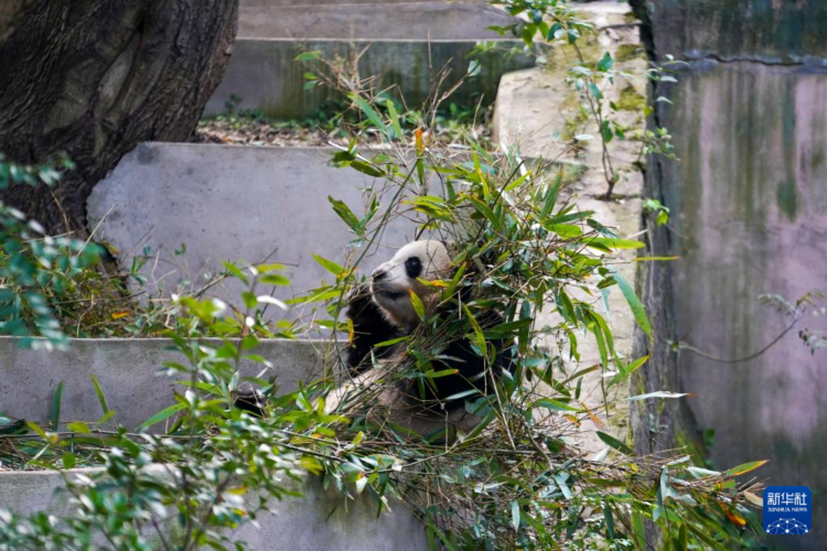 11月21日,在成都大熊猫繁育研究基地,大熊猫“梦想”在吃竹子。大熊猫“梦想”,雄性,2019年9月1日出生于德国柏林动物园。