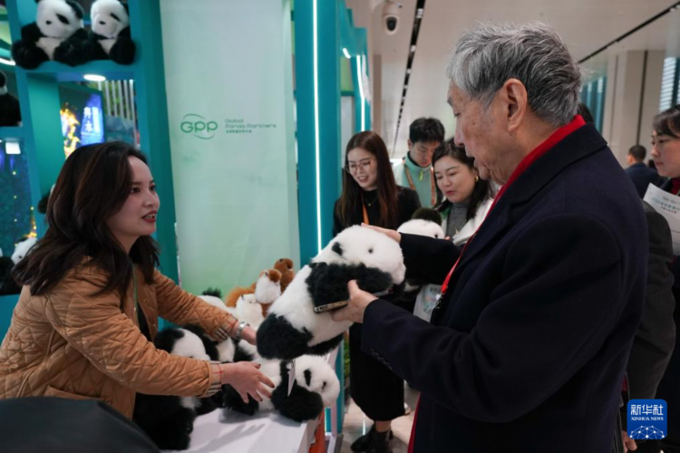11月26日,嘉宾在会场观看大熊猫玩偶。