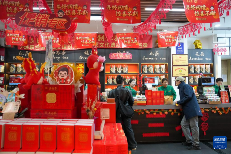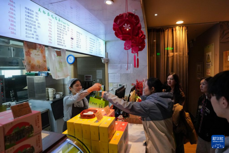 在位于北京前门大街的吴裕泰茶庄,工作人员(左一)将茶饼干递到顾客手中(11月15日摄)。