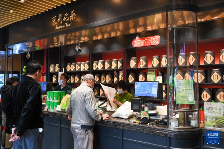 在吴裕泰北新桥总店,顾客在选购茉莉花茶(4月16日摄)。