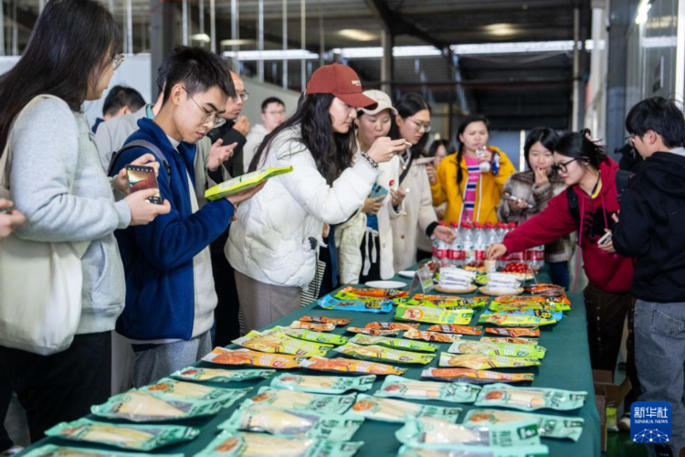 11月27日,在桃江县马迹塘镇笋竹特色产业园内一家鲜笋加工企业,访客在了解竹笋产品。