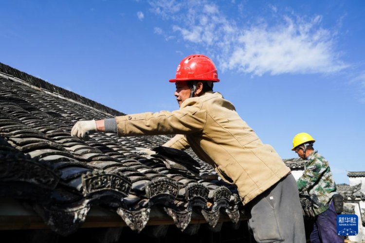 11月26日,维修工人在黄山市黟县西递村追慕堂对房屋瓦片进行整理。