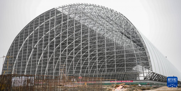 进行主体结构建设的六盘水市水城区煤炭储配基地4号储煤场(11月22日摄)。