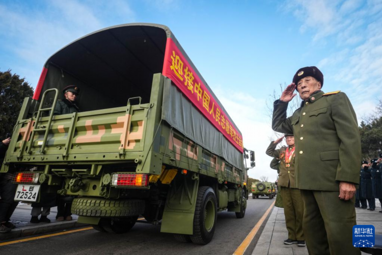 11月28日,运送志愿军烈士遗骸的车辆驶向沈阳抗美援朝烈士陵园。 新华社记者 潘昱龙 摄