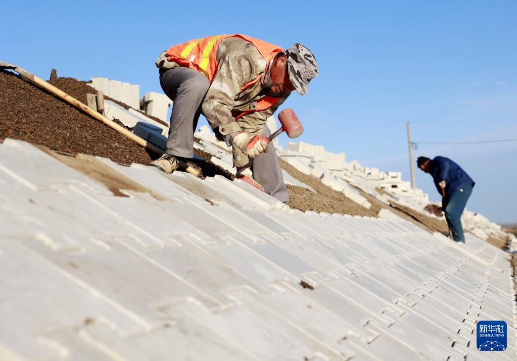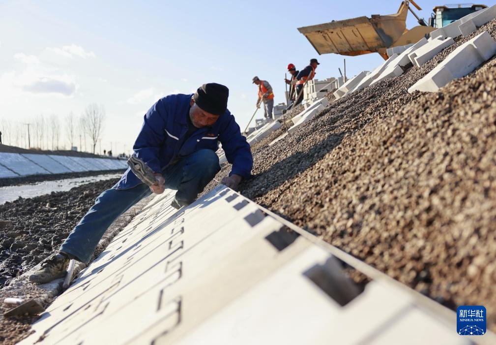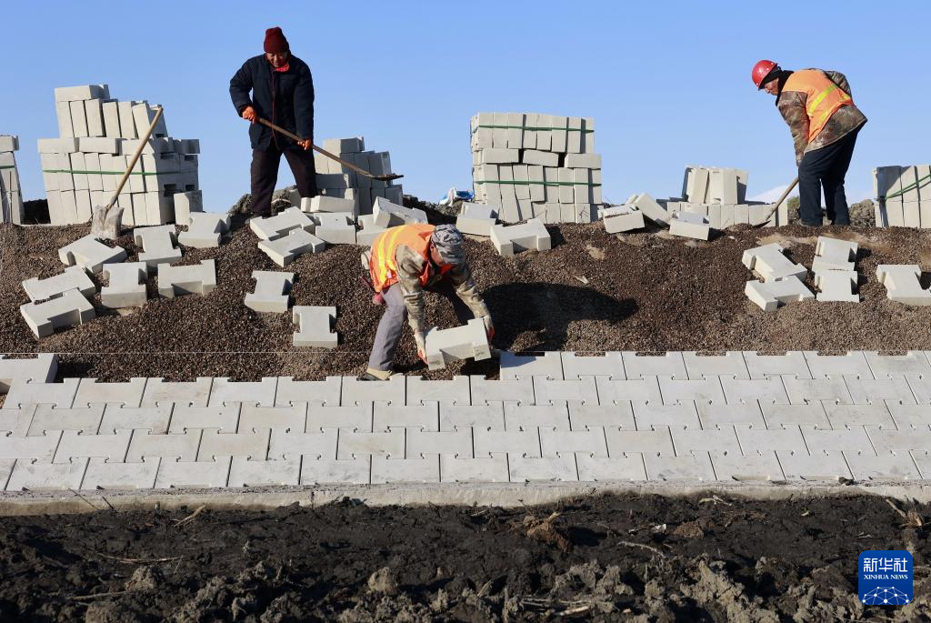 11月30日,工人在唐山市丰南区西葛镇越支四村灌溉水渠护坡加固工地施工。