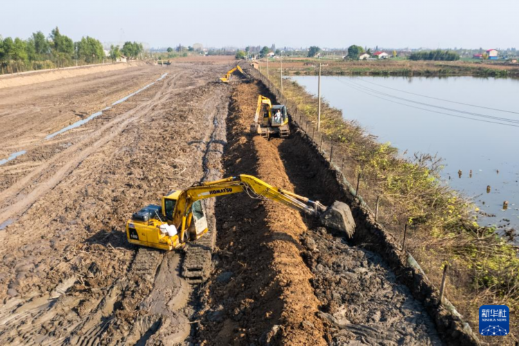 这是12月1日在华阁镇光复渔村拍摄的高标准农田建设灌溉系统施工现场(无人机照片)。
