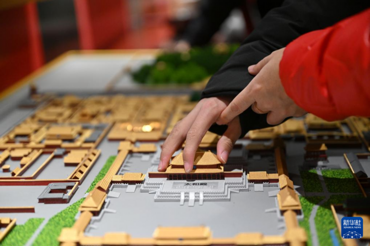 12月1日,北京市盲人学校学生在故宫文创融合馆内触摸故宫沙盘模型。