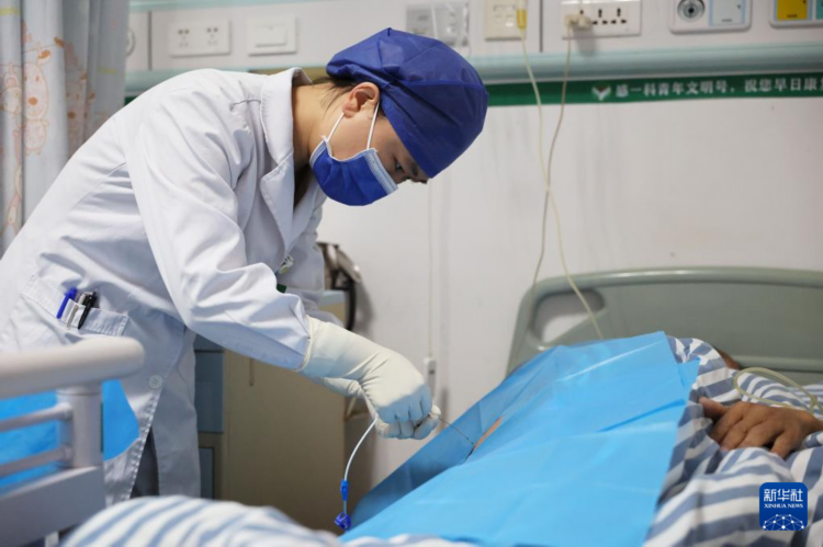 11月24日,在南宁市第四人民医院感染科一病区病房,赵蕊对病人进行诊疗操作。