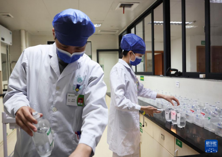 11月24日,在南宁市第四人民医院感染科一病区,护士为病人配药。