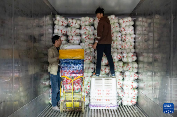 12月1日,工作人员在通海县杨广智慧农业小镇一家企业内将蔬菜码放在中铁特货冷链集装箱内。