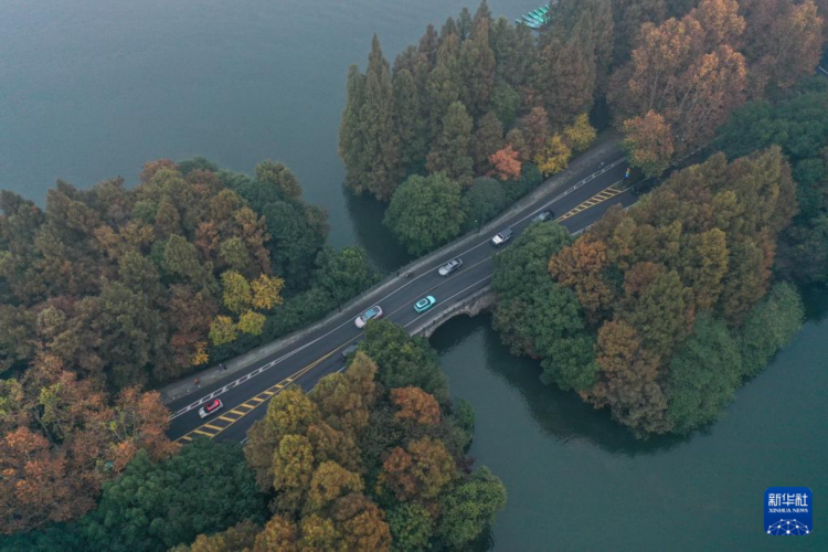 12月3日,汽车行驶在杭州西湖景区的杨公堤(无人机照片)。
