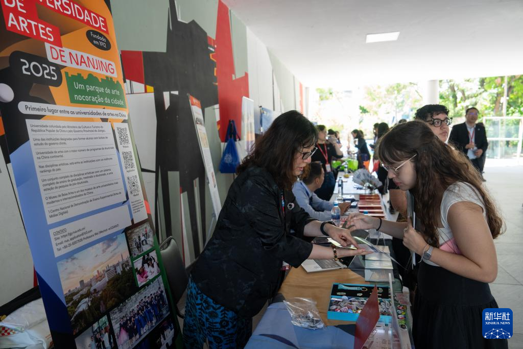 高等教育展助力中巴学术交流合作 11月25日,在巴西里约热内卢联邦大学举行的中国高等教育展上,一名参观者(前右一)与一名宣介人员(前右二)交流。 新华社记者 王天聪 摄