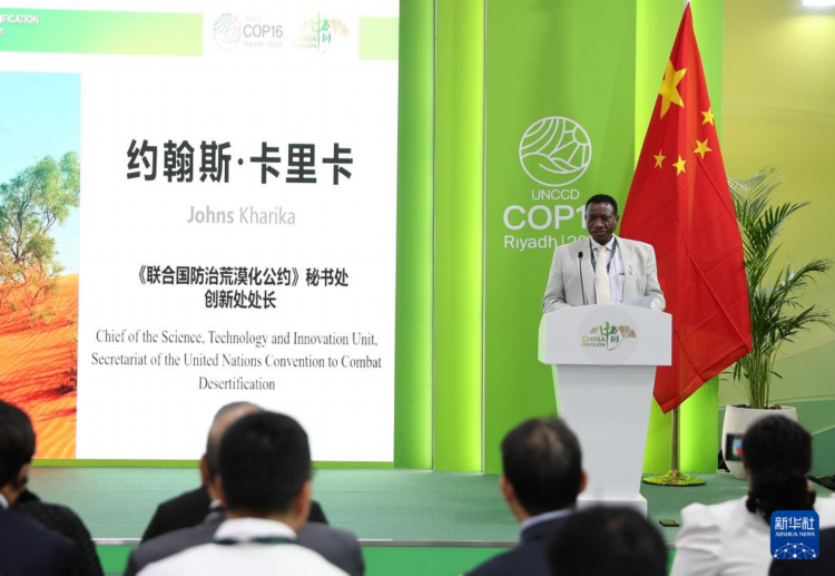 12月4日,在沙特阿拉伯利雅得《联合国防治荒漠化公约》第十六次缔约方大会(COP16)中国馆,《公约》秘书处创新处处长约翰斯·卡里卡在边会上发言。新华社记者 王东震 摄