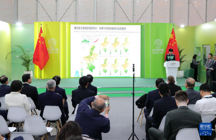 这是12月4日在沙特阿拉伯利雅得《联合国防治荒漠化公约》第十六次缔约方大会(COP16)中国馆拍摄的边会现场。《联合国防治荒漠化公约》第十六次缔约方大会(COP16)中国馆4日下午举办首场边会,向全球介绍荒漠化防治的“宁夏经验”。新华社记者 王东震 摄