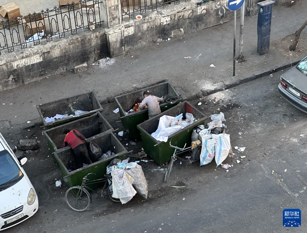 2024年12月3日,在叙利亚大马士革,两名少年在垃圾箱中捡拾塑料瓶(手机照片)。新华社记者 冀泽 摄