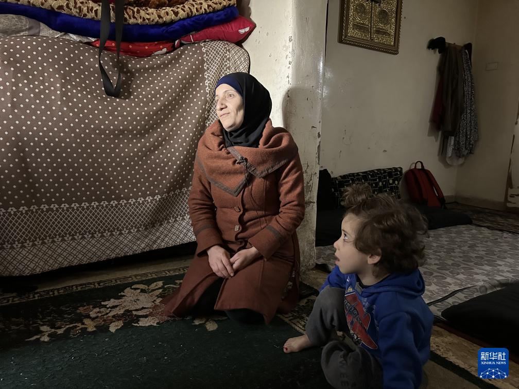 2024年1月24日,在叙利亚阿勒颇,叙利亚人哈迪亚·库尔迪与女儿在家中,他们依赖人道主义机构的援助维持生计(手机照片)。新华社记者 冀泽 摄
