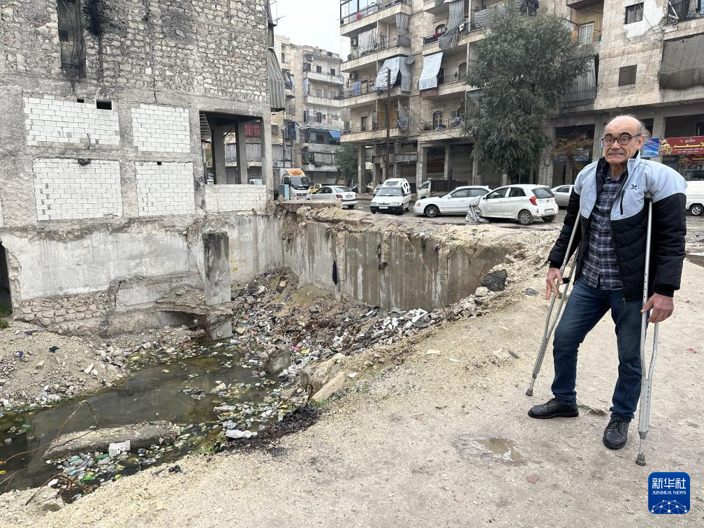 2024年1月26日,在叙利亚阿勒颇,被地震夺去双腿活动能力的当地居民叶海亚·卡克赫站在遭地震毁坏的房屋旁(手机照片)。新华社记者 冀泽 摄