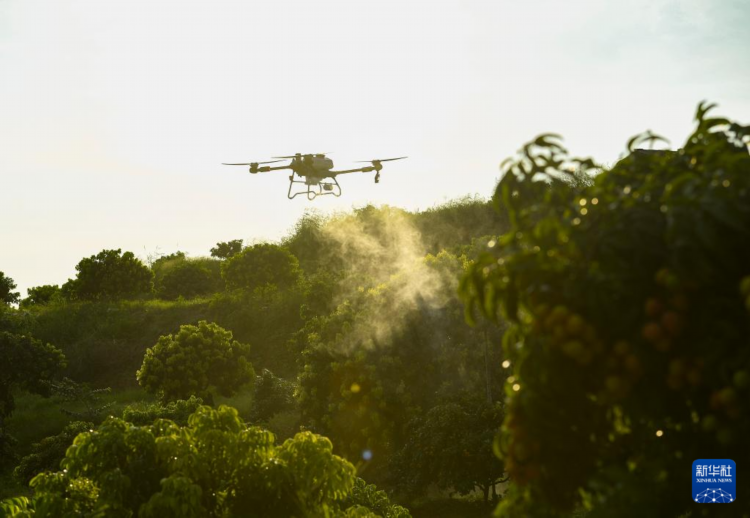 6月21日,大疆农业植保机在广州增城的荔枝林进行喷洒作业。