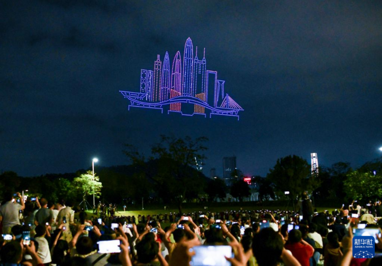 10月4日,大批市民游客在深圳福田区观看无人机表演。