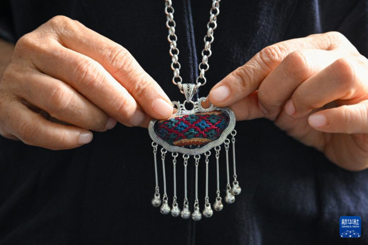 黎族织娘在位于海南省东方市东河镇的家中展示含有黎锦元素的吊坠(2023年6月7日摄)。