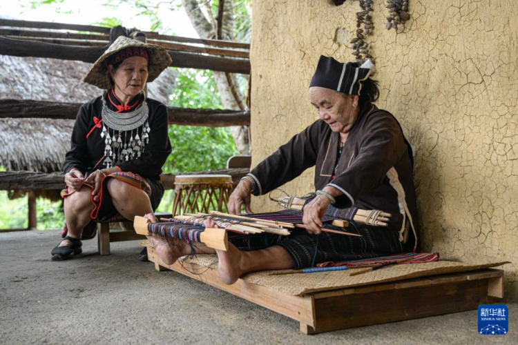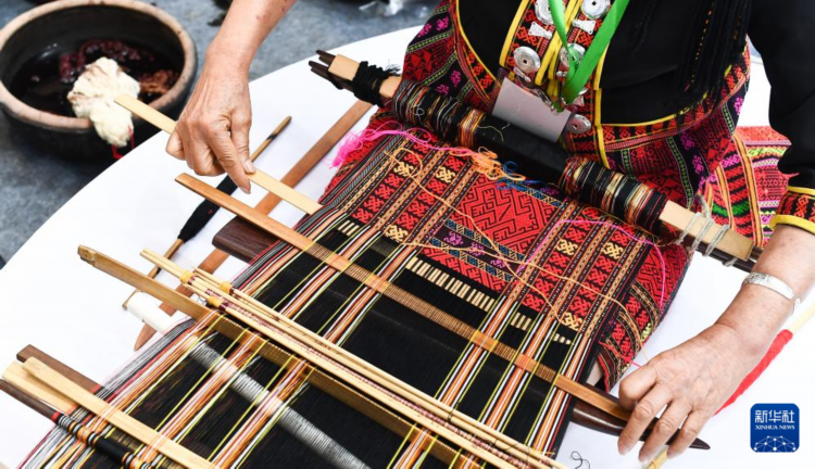 黎族传统纺染织绣技艺国家级代表性传承人刘香兰在海南省五指山市毛纳村展示织锦技艺(2024年5月22日摄)。