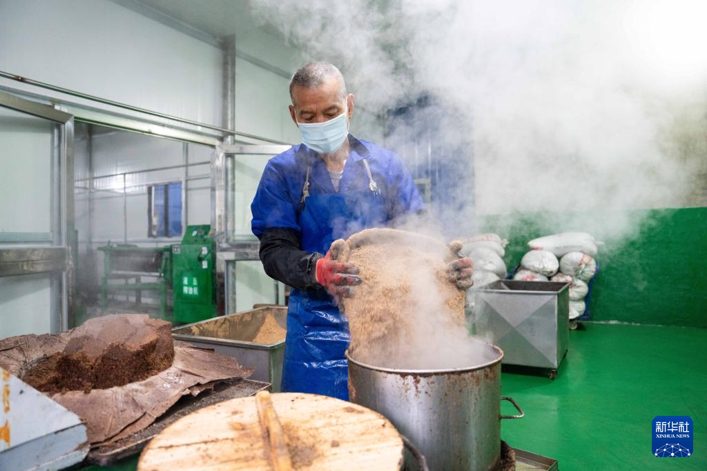 12月7日,工人在位于祁阳市八宝镇的湖南顾君茶油有限公司蒸茶粉。