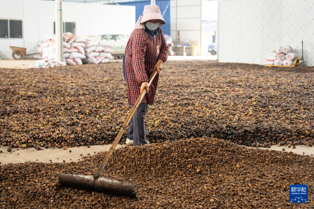 12月7日,工人在位于祁阳市八宝镇的湖南顾君茶油有限公司晾晒茶籽。