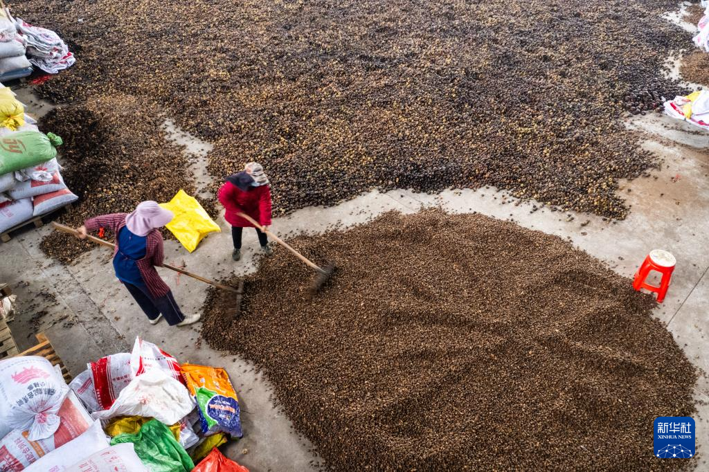 12月7日,工人在位于祁阳市八宝镇的湖南顾君茶油有限公司摊晾茶籽(无人机照片)。