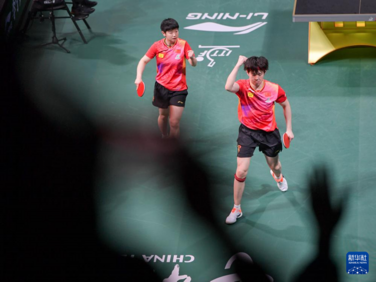 12月8日,中国队组合王楚钦(右)/孙颖莎在混双比赛中庆祝得分。最终,他们2比1战胜韩国队组合赵大成/申裕斌。