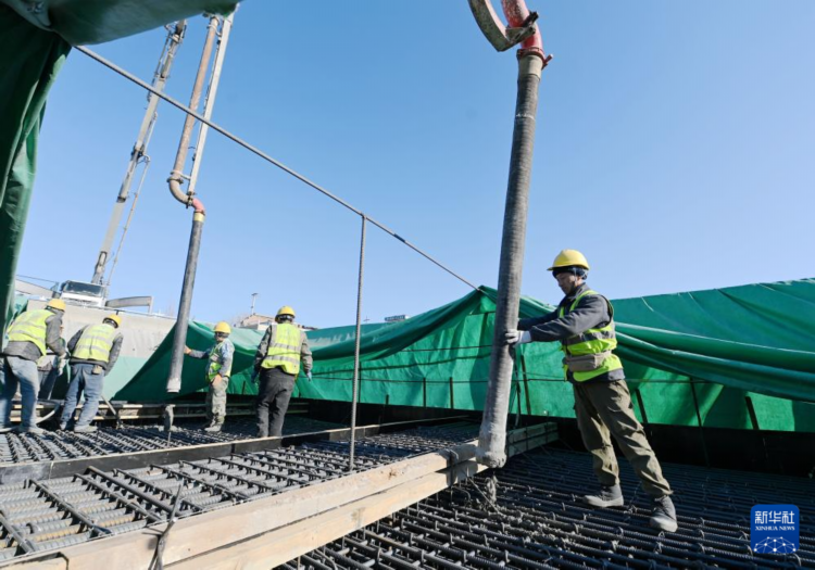 12月9日,工人在北京轨道交通22号线(平谷线)河北段高楼站建设现场施工。