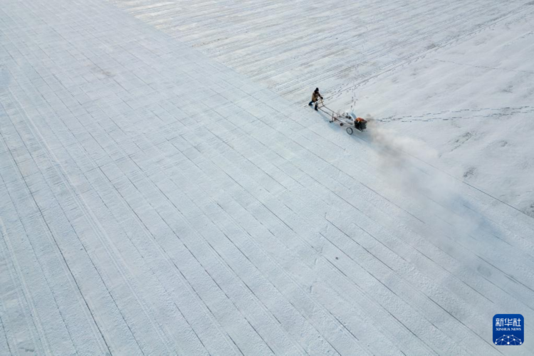12月9日,工人在松花江哈尔滨段采冰(无人机照片)。
