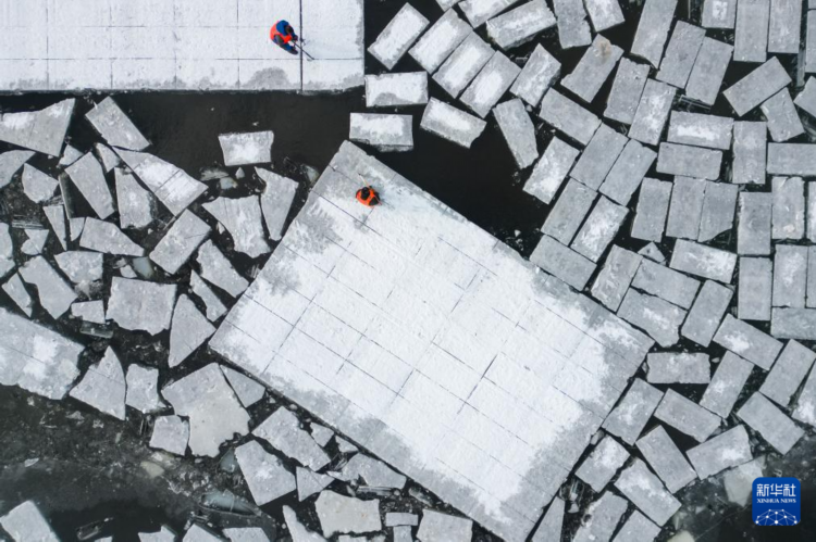 12月9日,工人在松花江哈尔滨段采冰(无人机照片)。