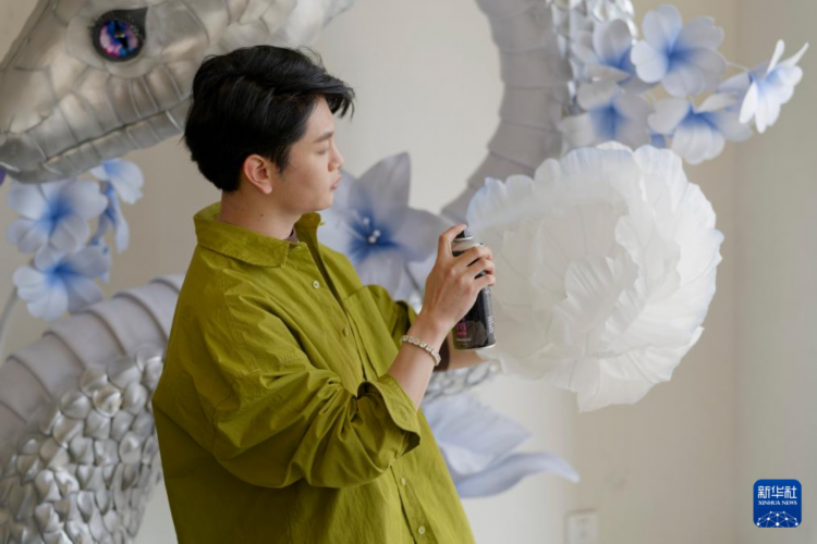 12月8日,在昆明市云南花伍科技股份有限公司,花艺师演示假花装置制作方法。