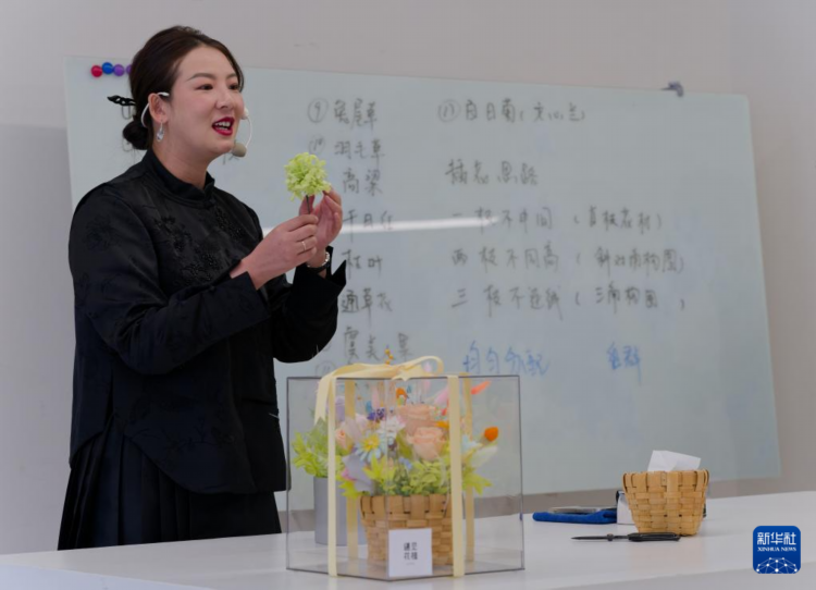 12月8日,在昆明市云南花伍科技股份有限公司,花艺师讲解永生花束制作技巧。