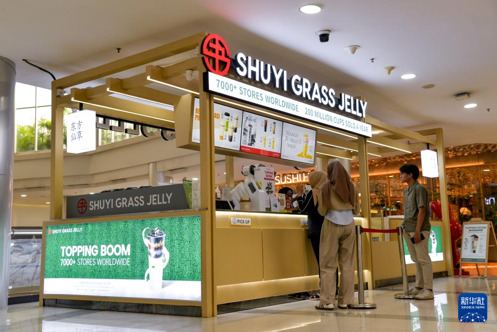 11月28日,在印度尼西亚德波,顾客在一家书亦烧仙草门店购买饮品。