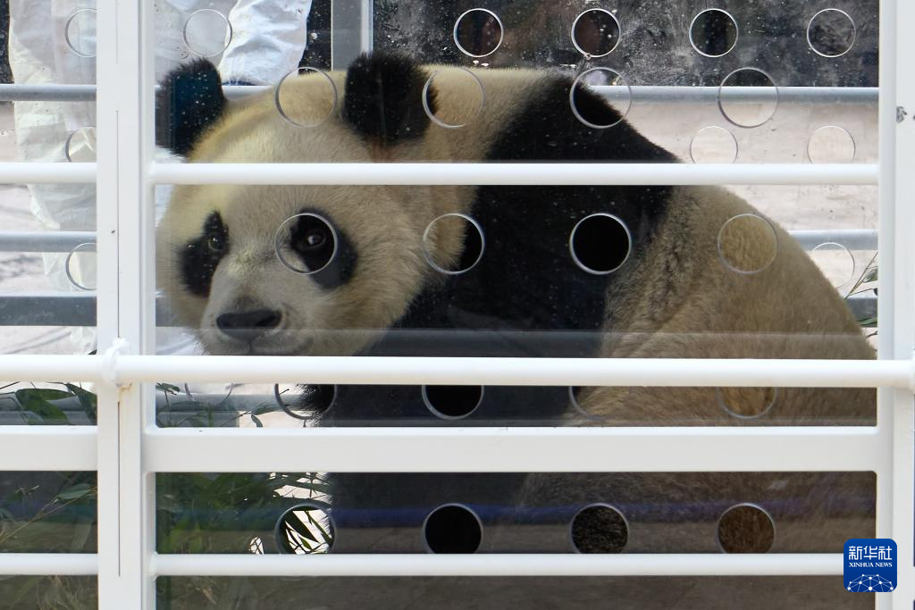 这是12月10日在比利时布吕热莱特的天堂动物园拍摄的运输箱中的大熊猫“宝妹”。新华社记者 孟鼎博 摄