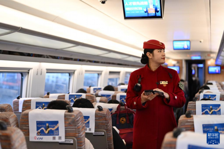 12月10日,京津城际C2002次列车长白蕊在车厢内巡视。