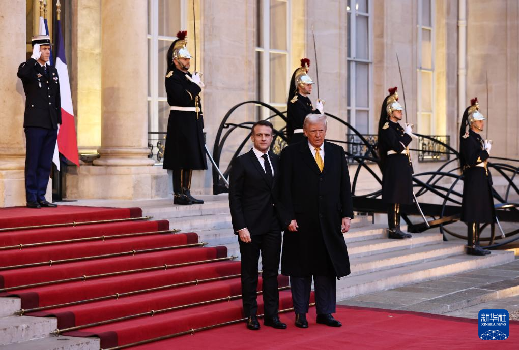 马克龙与特朗普会晤 12月7日,法国总统马克龙(前左)在巴黎总统府爱丽舍宫欢迎美国当选总统特朗普(前右)。 法国总统马克龙7日在爱丽舍宫与受邀出席巴黎圣母院重新开放仪式的美国当选总统特朗普会晤。 新华社记者 高静 摄