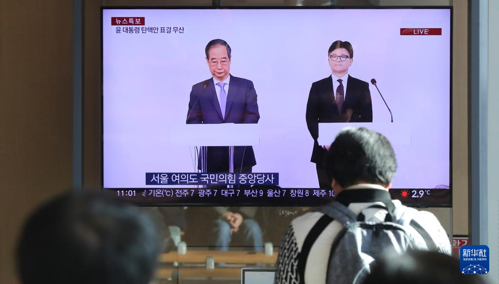 韩国执政党党首与国务总理:总统将不再参与国政 12月8日,在韩国首尔火车站,民众观看韩国执政党党首韩东勋与国务总理韩德洙(左)共同会见记者的电视直播。 当日,韩国执政党国民力量党党首韩东勋与国务总理韩德洙共同会见记者时表示,将有秩序地推进提早结束总统任期,总统尹锡悦下台前将不再参与包括外交在内的国政事务。 新华社记者 姚琪琳 摄