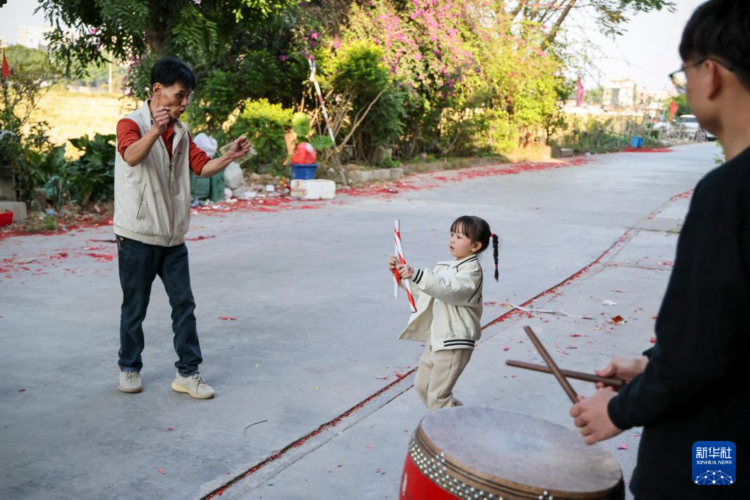 12月9日,广东省汕头市潮阳区贵屿镇玉窖村举办民俗活动,5岁女童庄恩琪手持英歌槌,跟随鼓点节奏与当地的英歌队员一同起舞,动作有力且充满韵律,赢得了在场观众阵阵掌声。