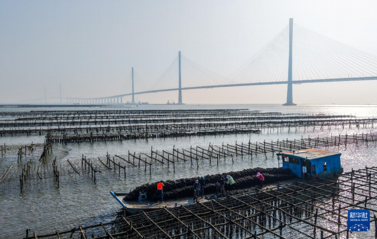 蚝农在黄茅海大桥西侧水域收获国家农产品地理标志产品江门台山蚝(12月7日摄,无人机照片)。
