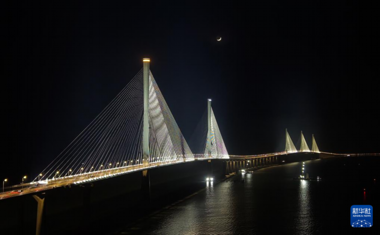 夜幕下的高栏港大桥(左侧双主塔)和黄茅海大桥(右侧三主塔)(12月4日摄,无人机全景照片)。