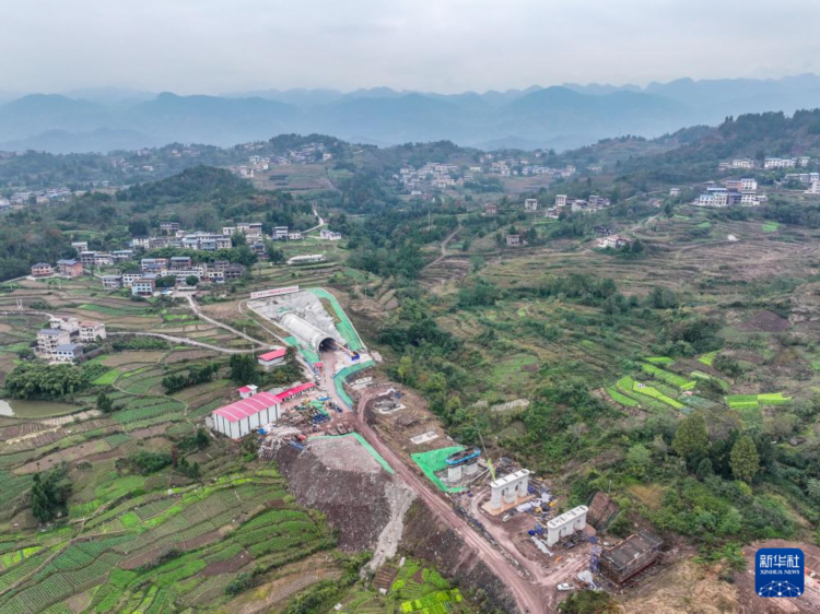 12月12日拍摄的成达万高铁石坪村隧道口建设施工现场(无人机照片)。