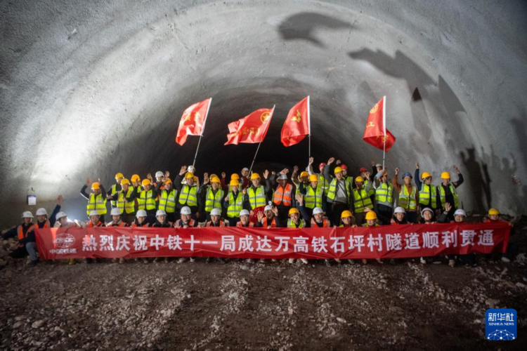 12月12日,在成达万高铁石坪村隧道建设施工现场,工人在庆祝隧道贯通。
