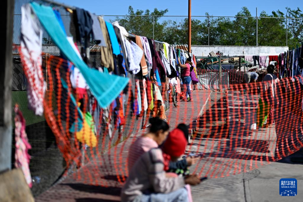 12月11日,在墨西哥边境城市雷诺萨的一处移民收容所里,人们晾晒衣物。