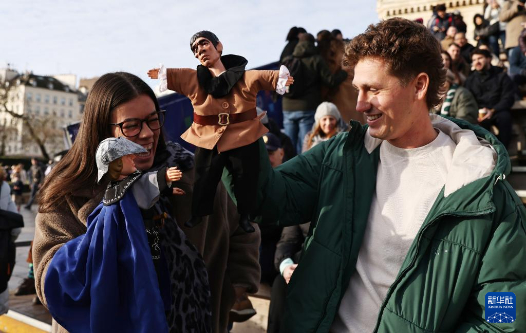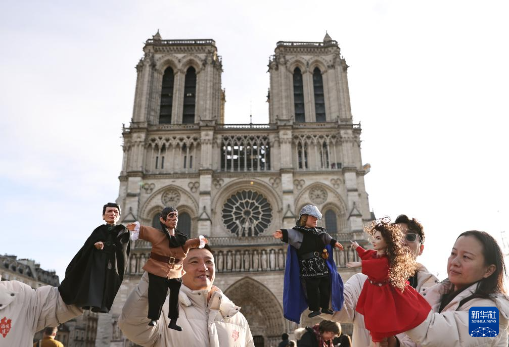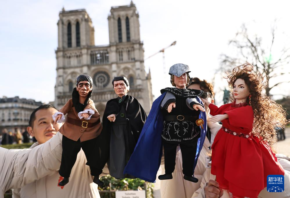 12月15日,在法国巴黎圣母院前,来自中国福建展演团的演员表演布袋木偶戏《巴黎圣母院》。 中法美丽乡村行活动于17日晚拉开帷幕,由中国歌剧研究会、福建艺术职业学院和法国美丽乡村联盟共同主办,旨在促进文明互鉴和文化交融。活动开幕前夕,中国福建展演团在重新开放的巴黎圣母院前举行快闪活动,在熙攘的游客群中演绎布袋木偶戏《巴黎圣母院》。 新华社记者 高静 摄