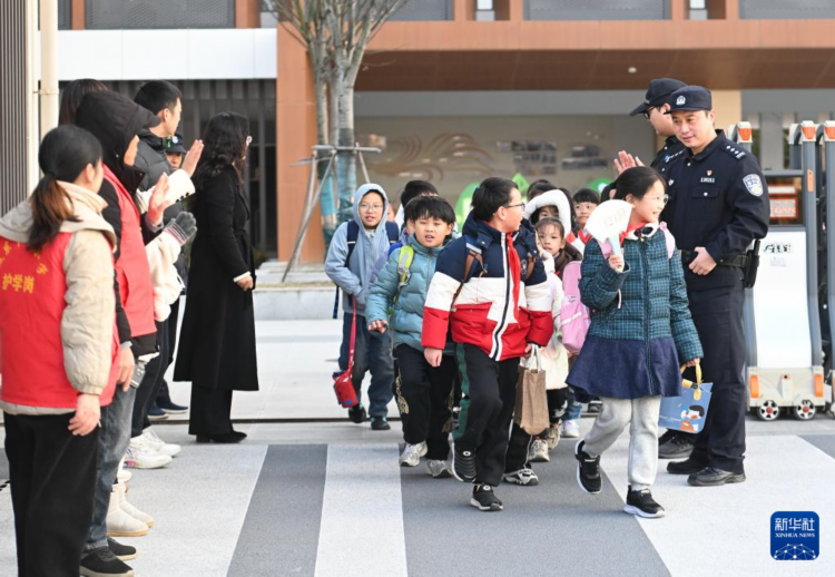 12月18日,民警、老师、志愿者等在泰州市城东中心小学护学。