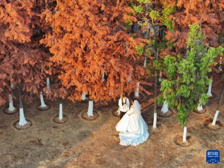 12月18日,一对新人在湖南松雅湖国家湿地公园拍摄婚纱照(无人机照片)。