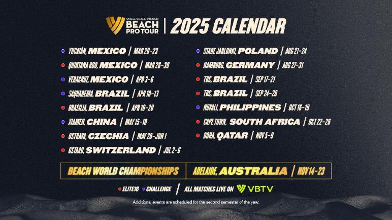 2025年沙滩排球职业巡回赛将进行至明年11月。巡回赛结束后,各队将参加11月中下旬在澳大利亚阿德莱德举行的2025年沙排世锦赛。